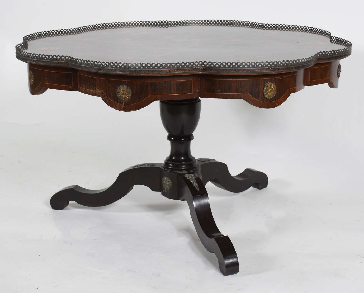 Mesa de madeira nobre, tampo redondo, base torneada com coluna central terminando em 3 pernas.