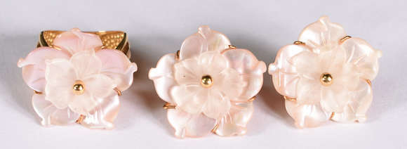 Conjunto , par de brincos tipo flor e anel de ouro e madre pérolas . Aro 17 ( por questão de segurança a peça não s...