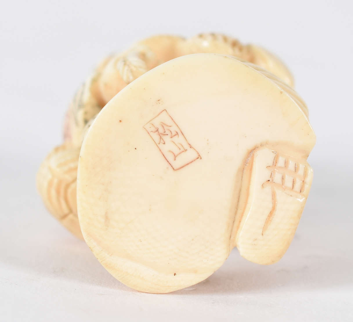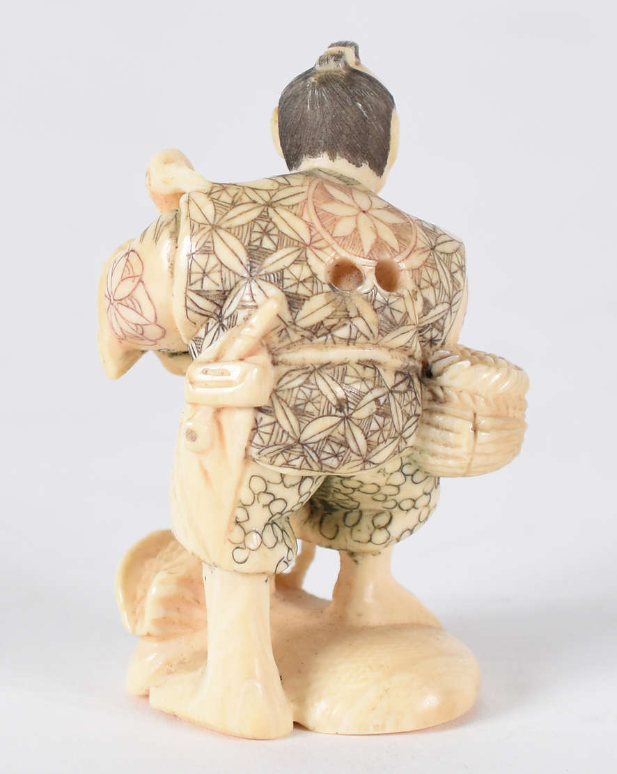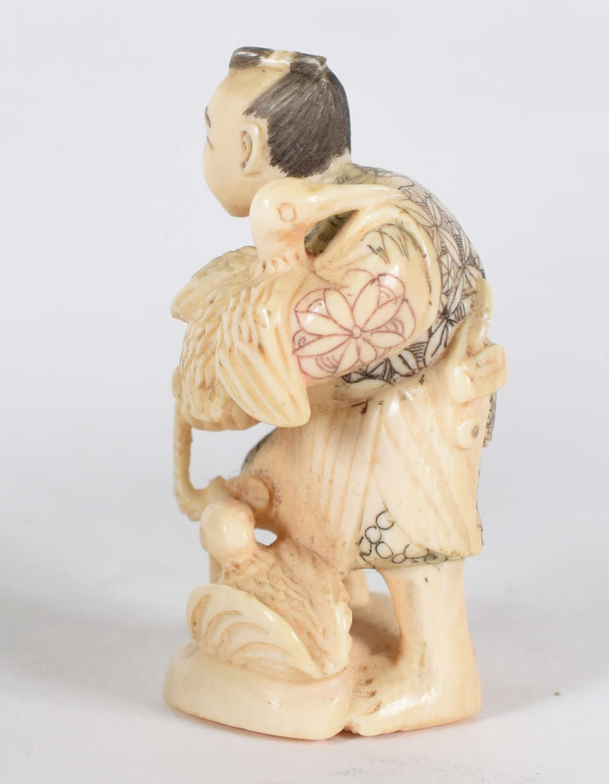 Netsuke de marfim , assinado , representando chinês com gaivota