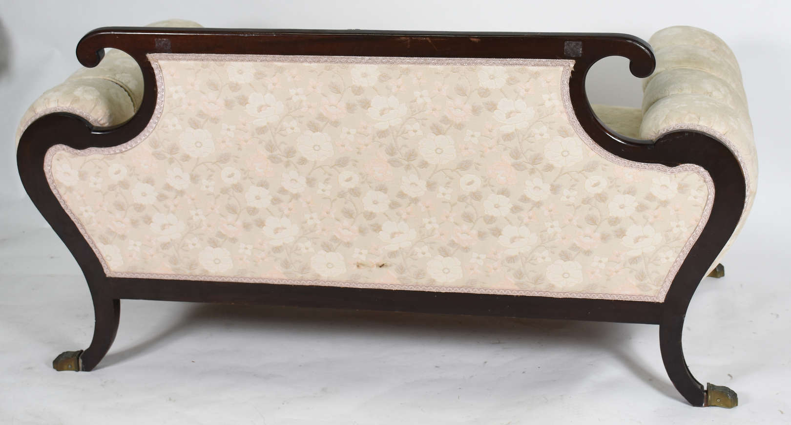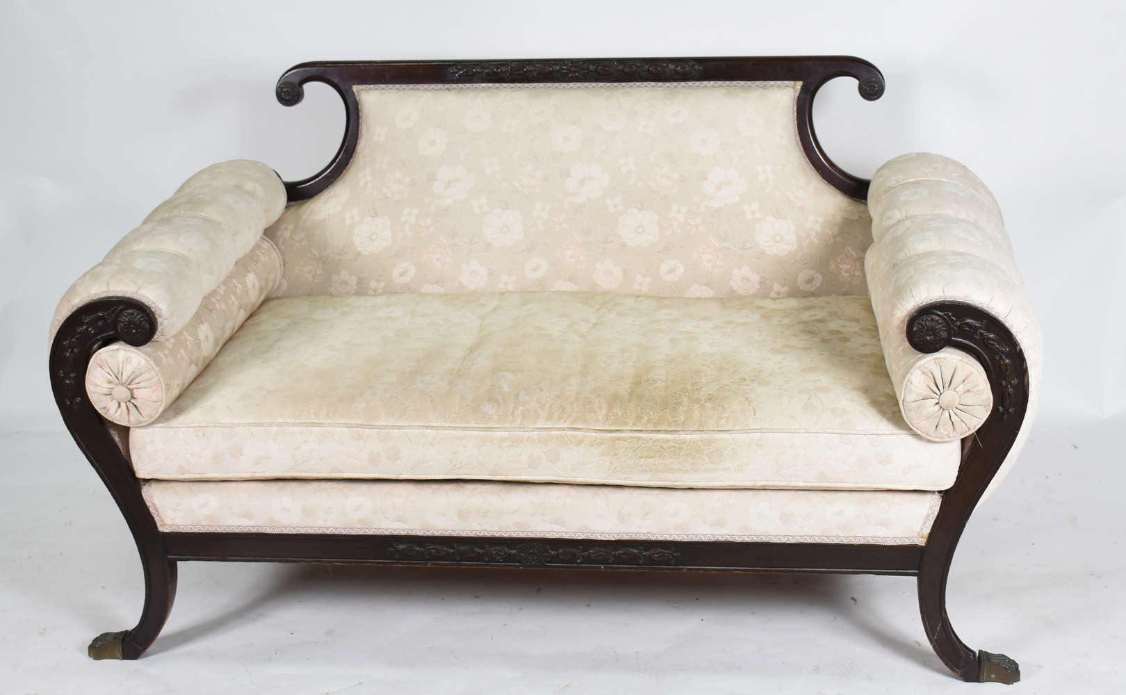 Sofá para tres lugares de madeira com resquícios de lacca negra e pinturas douradas, encosto com varetas torneadas (f...