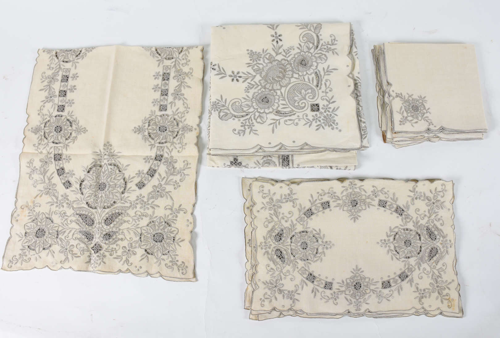 Toalha de mesa de linho bege com bordado colorido e 12 guardanapos ( com pequenos furos )