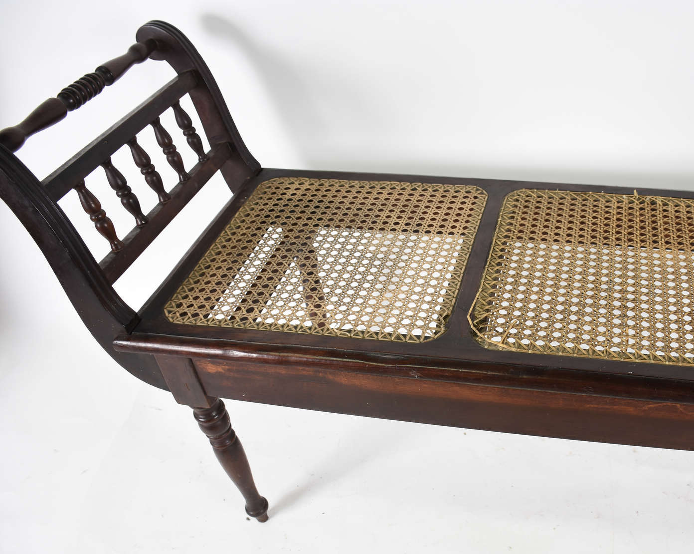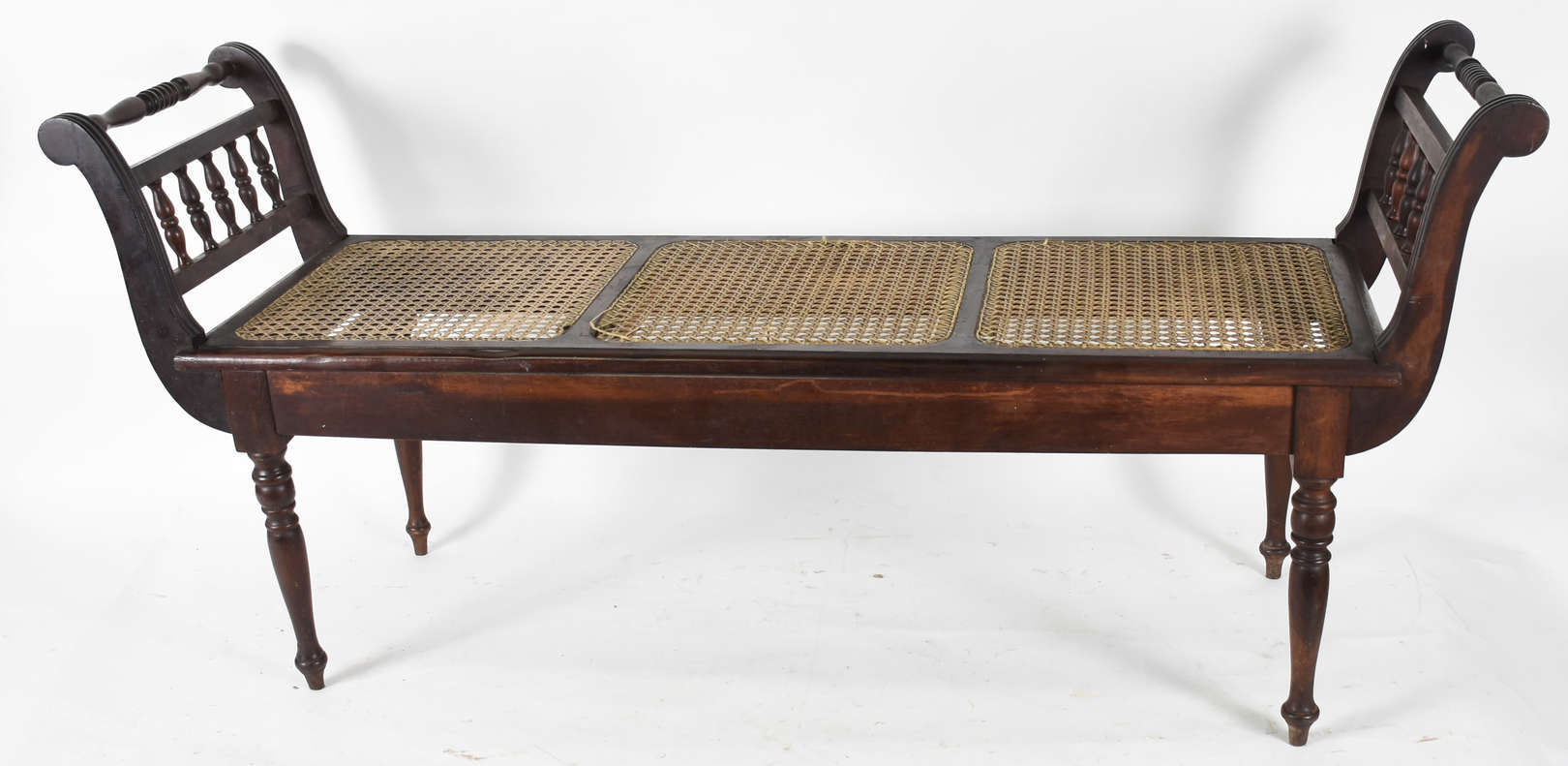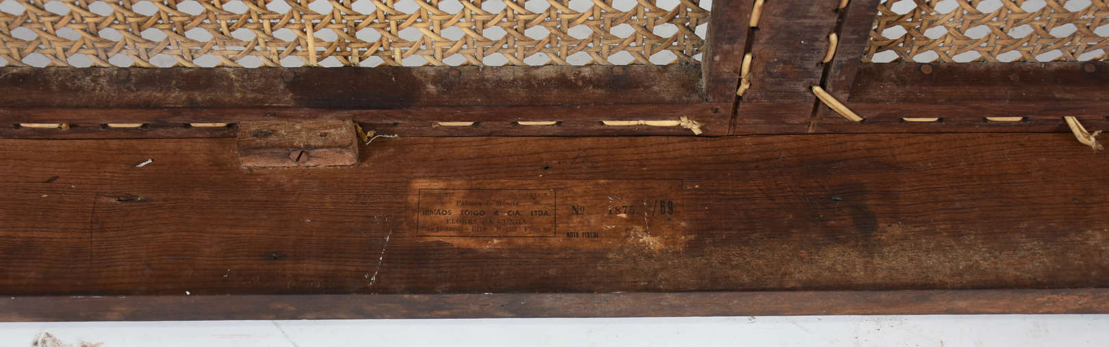 Sofá de madeira nobre para 3 lugares com assento em palhinha, encosto com traves circulares.