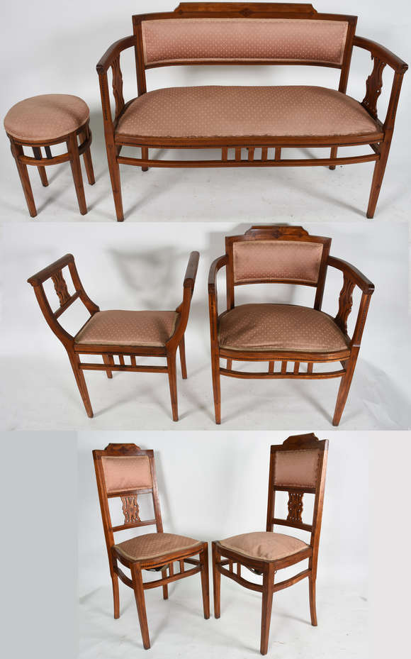 Conjunto de madeira nobre filetado , estofado na cor salmão com " pois" branco.Composto de 4 peças , sofá, cadeira ,...