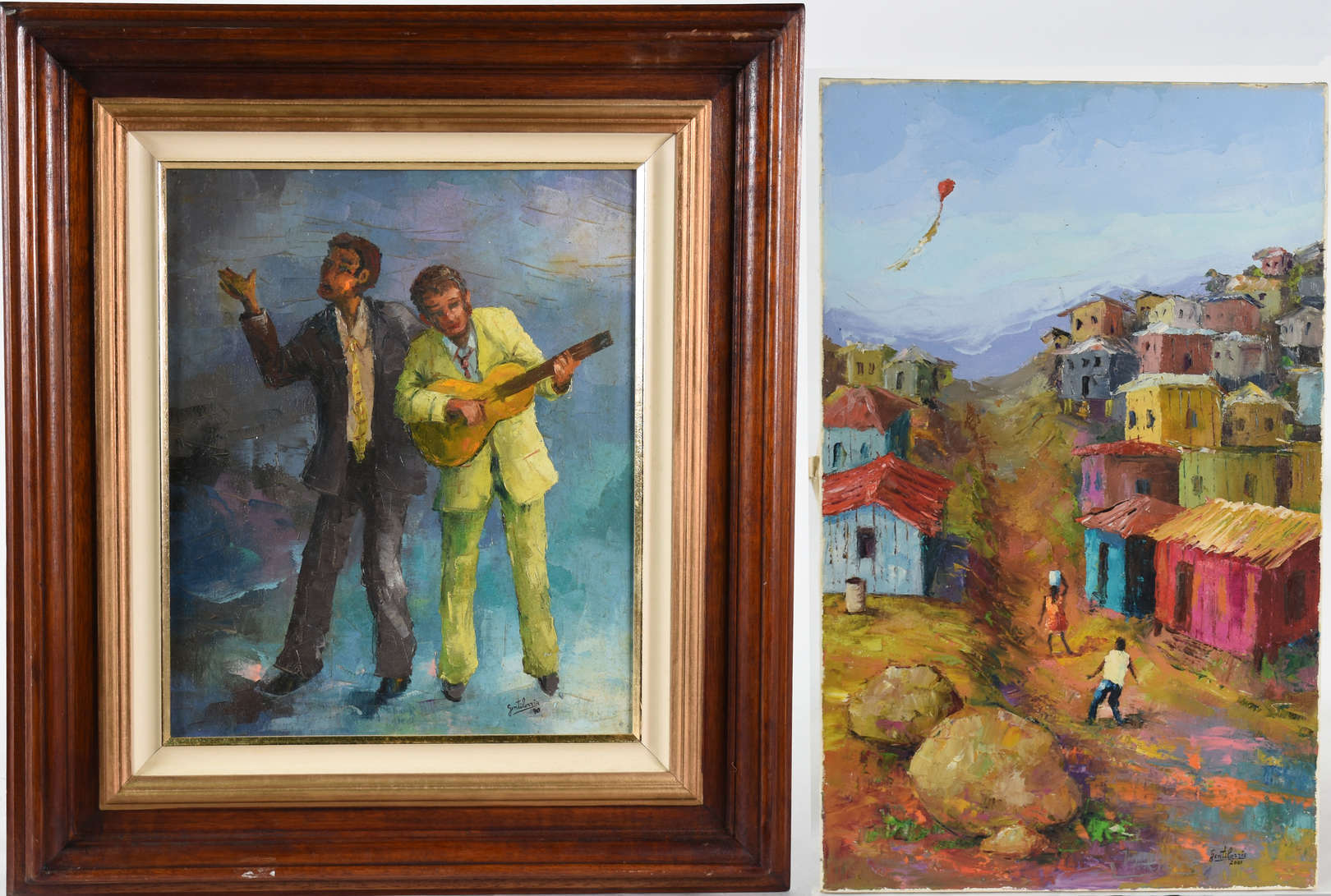Dois quadros, PEDRO NASCIMENTO ( 1978) - paisagem - o.s.t.- 32 x 40 cm BARBOSA- favela - o.s.e - 27 x 22 cm