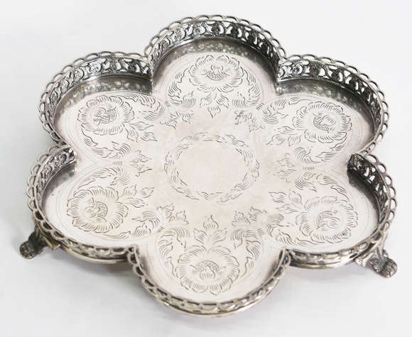 Salva de prata contraste 835 mls , borda em gomos , fundo cinzelado e pés de garra. ( Por questão de segurança a peç...