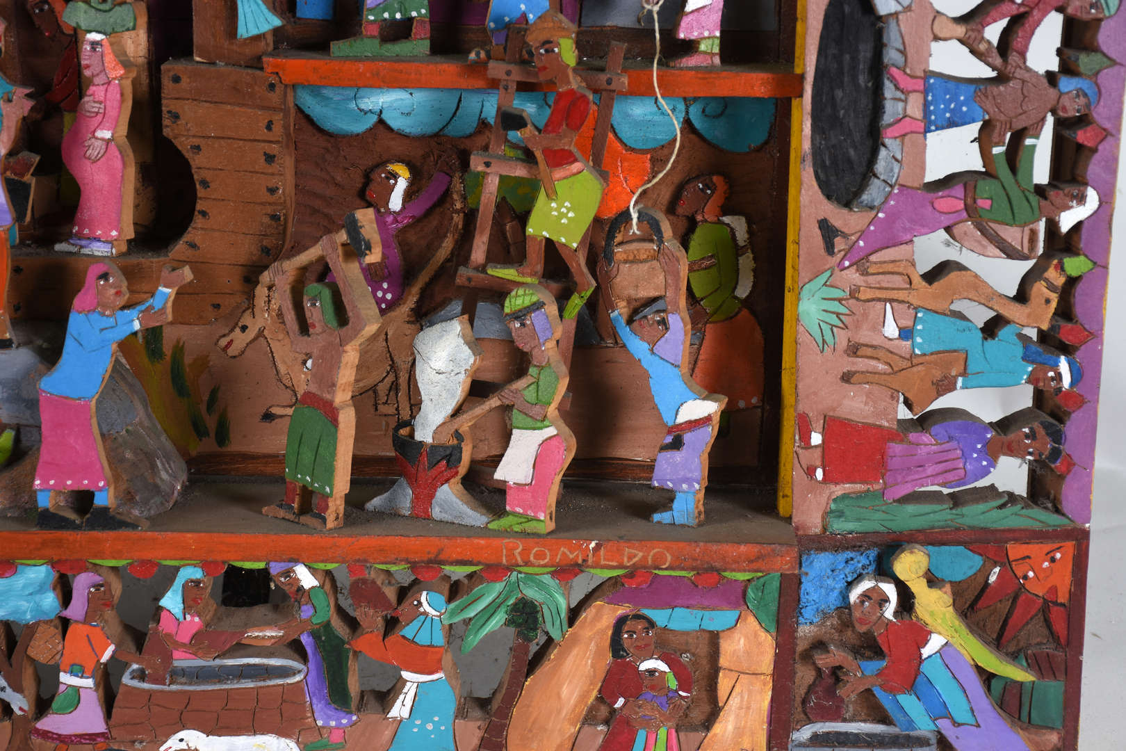 Duas peças de madeira, sendo ; Cristo estilizado , assinado, (braço colado) e relógio rústico a pilha.