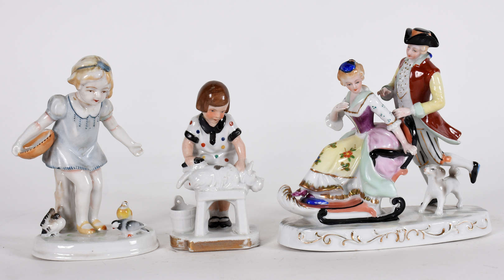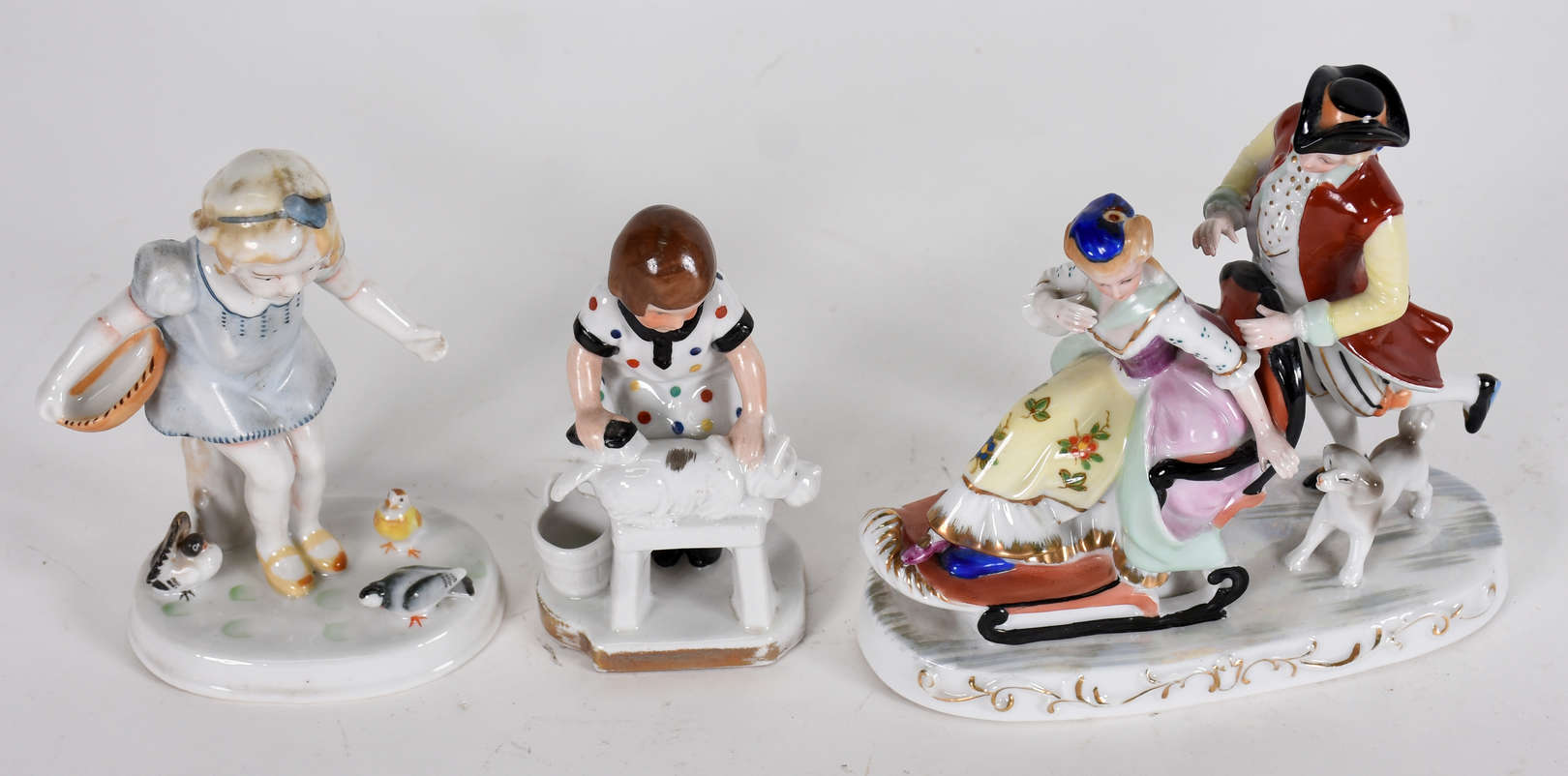 Grupo escultórico representando " Menina com ave " , marcada na base porcelana Européia ENS .
