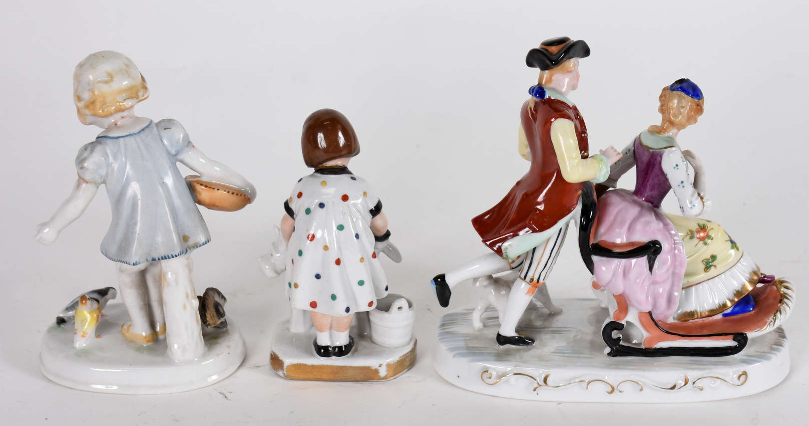 Escultura de porcelana europeia representando Jovem com pássaro , ricamente trabalhada em policromia ( com restauro n...
