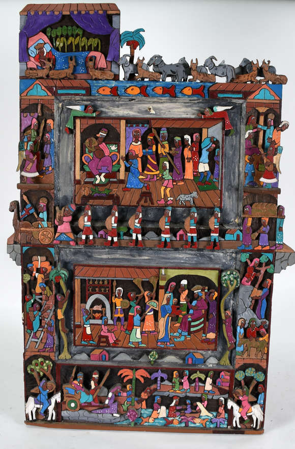 Escultura de madeira com entalhes e pintura policromada. Assinada.