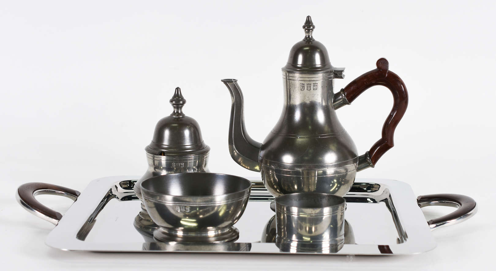 Baixela para chá e café inox fracalanza , composta de 2 bules , açucareiro, manteigueira e bandeja .