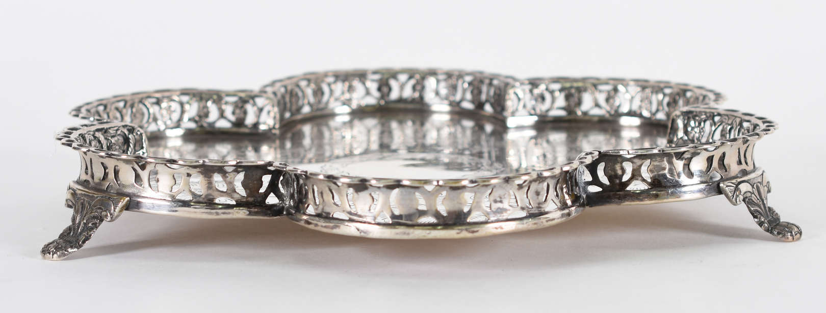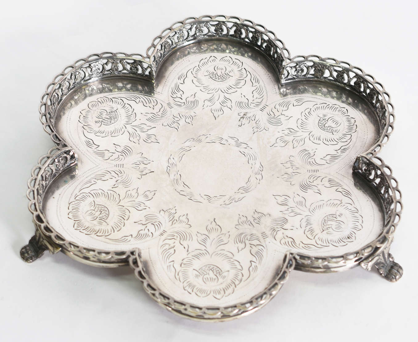Salva de prata contraste 835 mls , borda em gomos , fundo cinzelado e pés de garra. ( Por questão de segurança a peça não se encontra na loja )