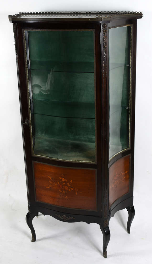 Vitrine estilo Francês , feitio semi bombê com interior forrado e 2 prateleiras de vidro .