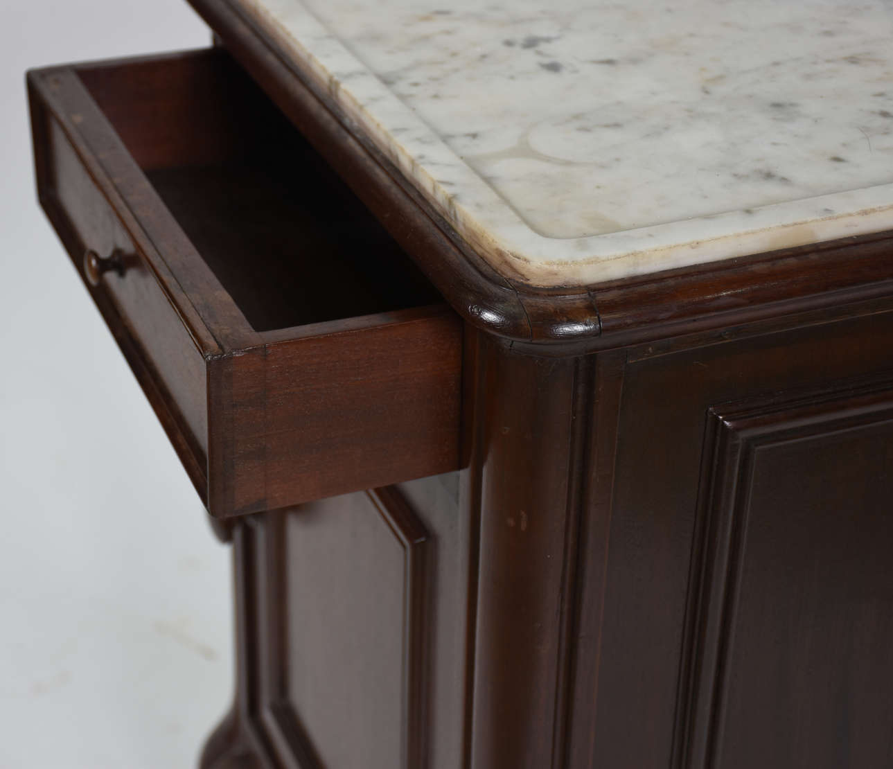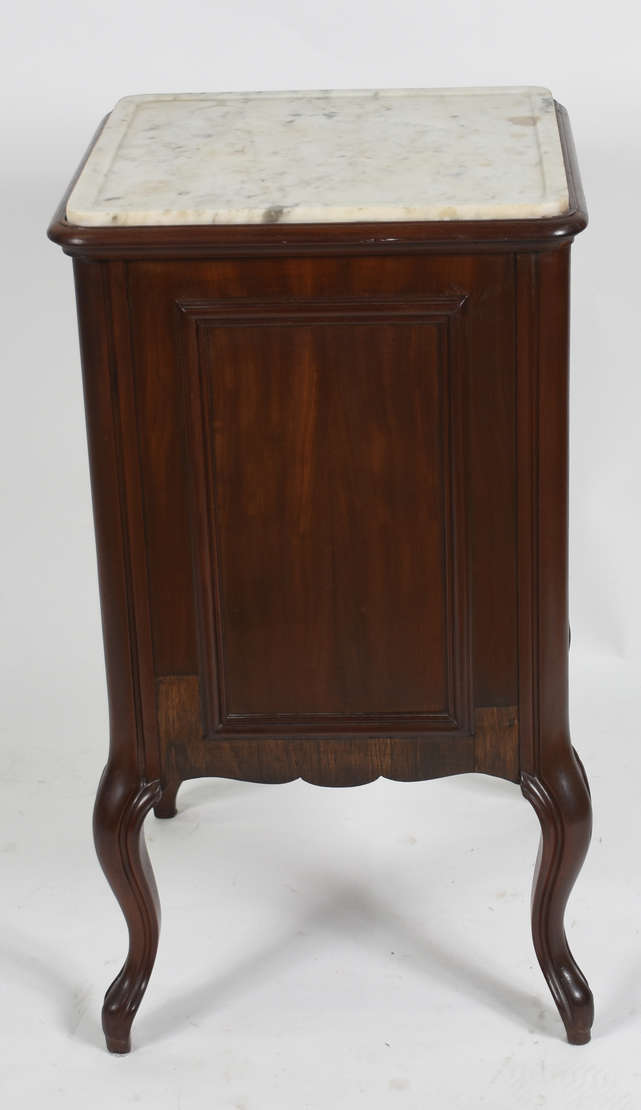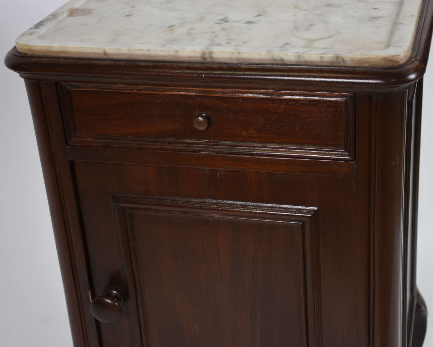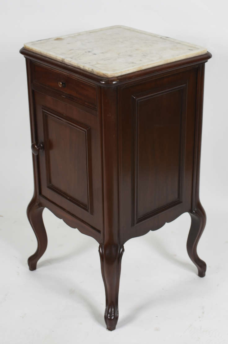 Par de mesas de cabeceira de madeira nobre com detalhes entalhados, feitio oval, uma gaveta cada e platô inferior.