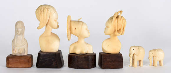 Seis pequenas esculturas de marfim africano com bases de madeira .