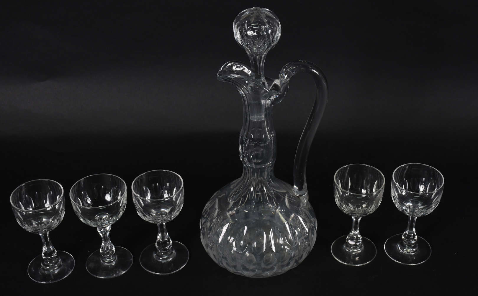 Garrafa de cristal double lapidada na cor âmbar , acompanha 5 cálices .( Tampa com pequeno lascado )
