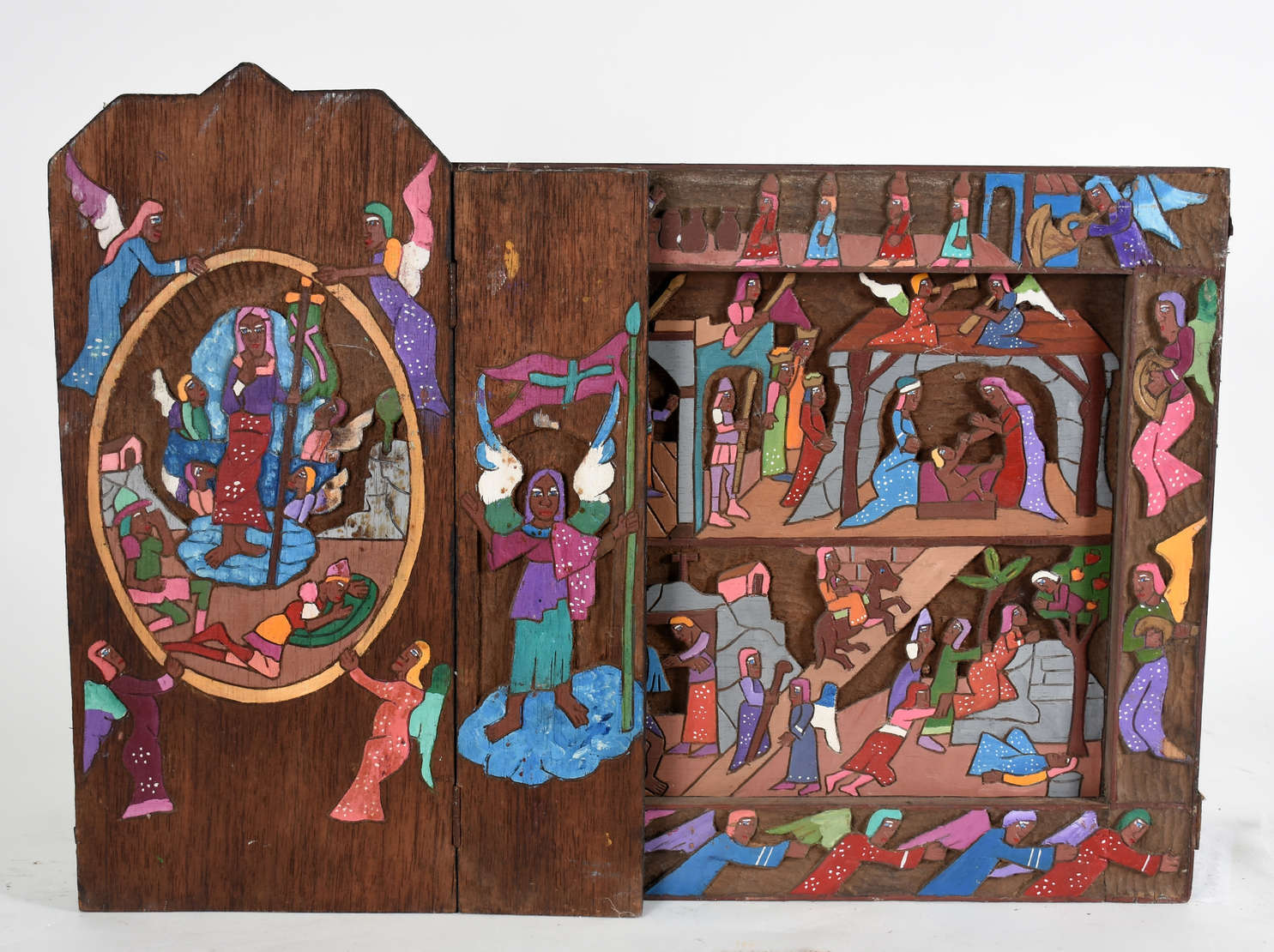 Duas peças de madeira, sendo ; Cristo estilizado , assinado, (braço colado) e relógio rústico a pilha.