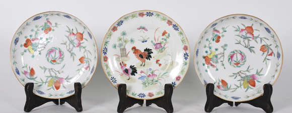 Três pratos de porcelana Companhia das Indias, sendo um do Serviço de Galos de D.João VI, e outros dois com frutos em...