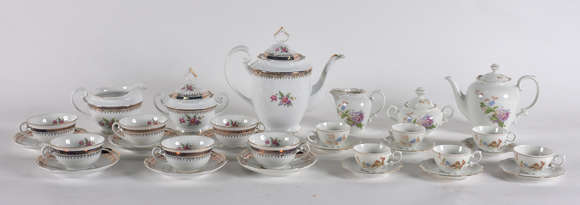 Dois serviços, 1 para chá de porcelana Steatita composto de , 6 xícaras com pires , bule, leiteira e açucareiro . To...