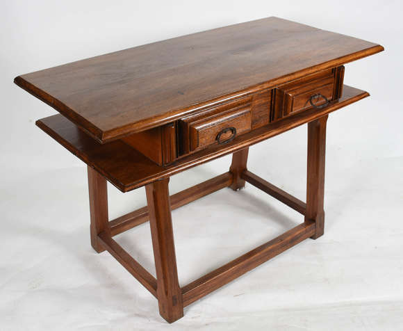 Mesa de vinhático com 2 gavetas com puxadores de metal , base feitio cavalete estilo colonial brasileiro.