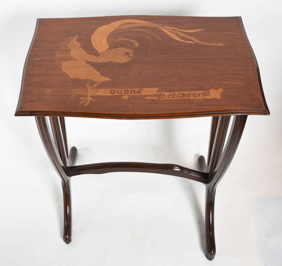 Não vendidoLote 161 - Ao vivo! Excepcional mesa francesa de chá, ART NOUVEAU , madeira nobre com tampo trabalhado em marqueterie decorado com figura... 71 x 60 x 40 cm