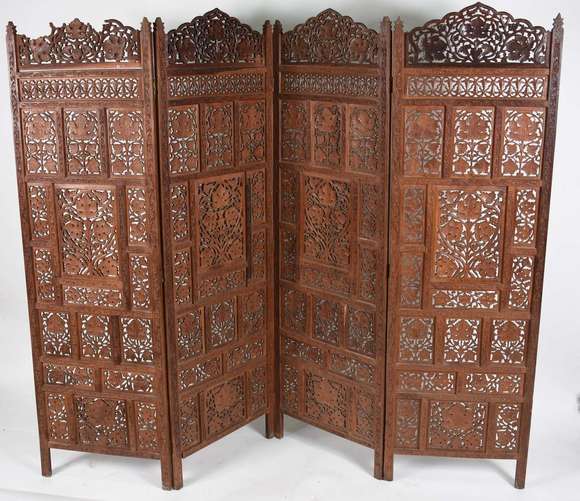 Biombo Indiano de quatro folhas, madeira nobre com entalhes e vazados. Obs. Uma das terminações superiores faltando a...