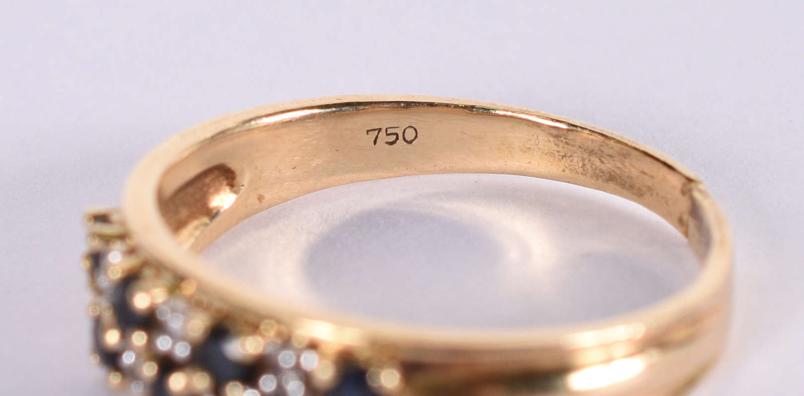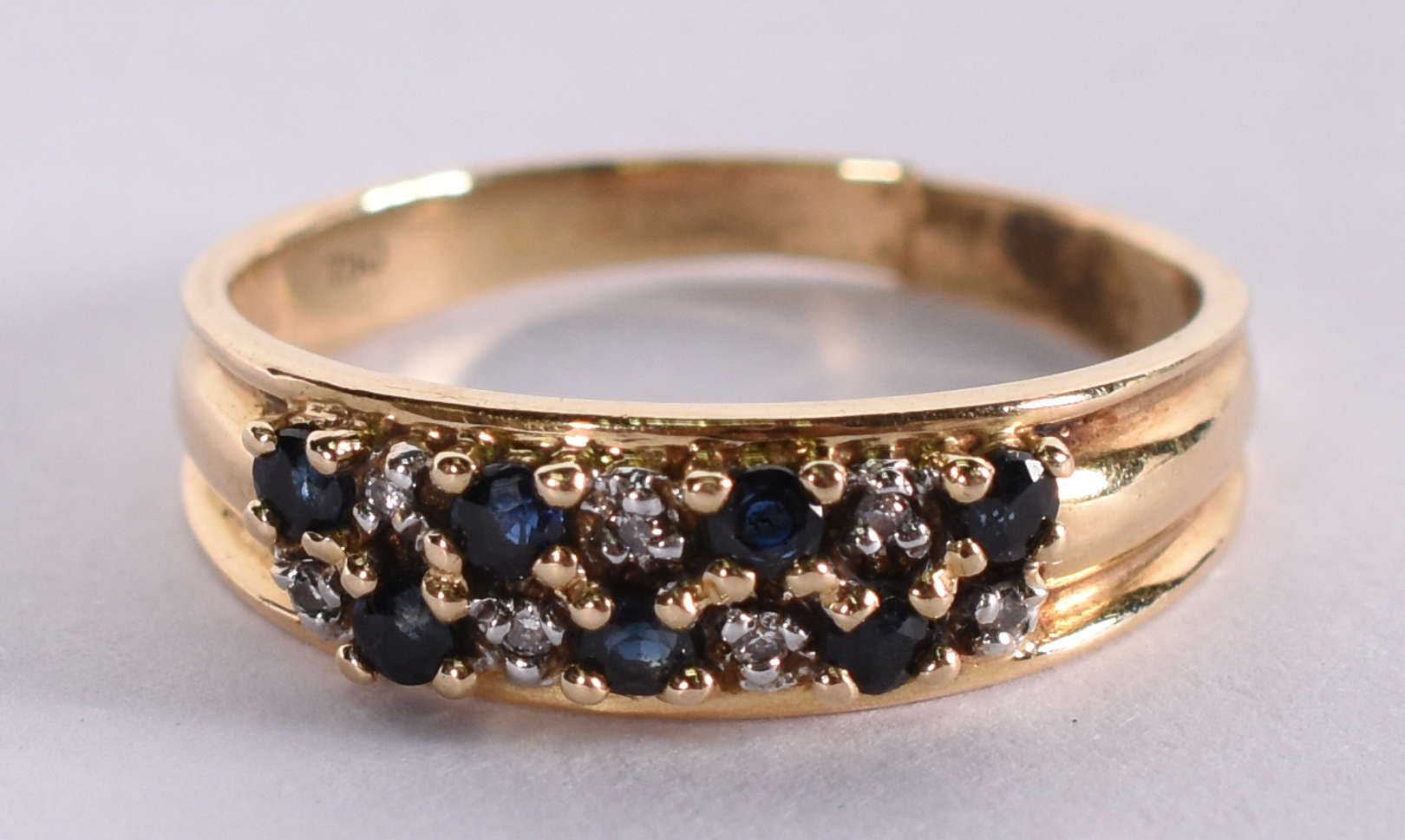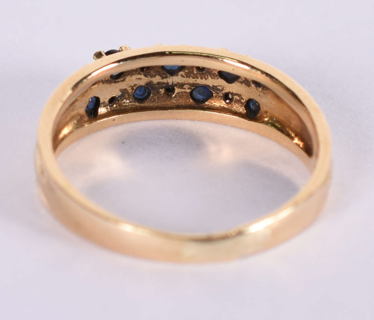 Anel de ouro amarelo com 8 brilhantes e 5 safiras azuis . Aro 17 ( Por questão de segurança a peça não se encontra n...