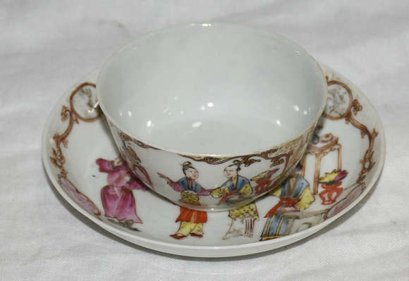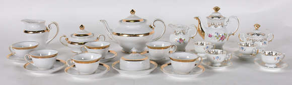 Dois serviços , 1 para chá composto de , bule , leiteira , manteigueira , açucareiro ( alça colada), 6 xícaras com ...