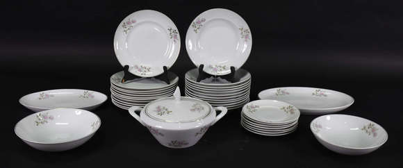 Aparelho de jantar porcelana Steatita , composto de 12 pratos rasos , 12 fundos , 7 sobremesa , sopeira , 2 travessas...
