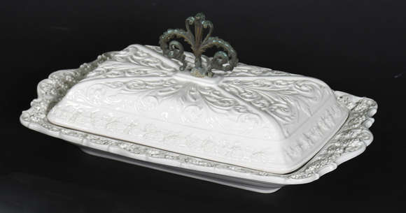 Terrina italiana de porcelana branca trabalhada em relevo, pega de metal.