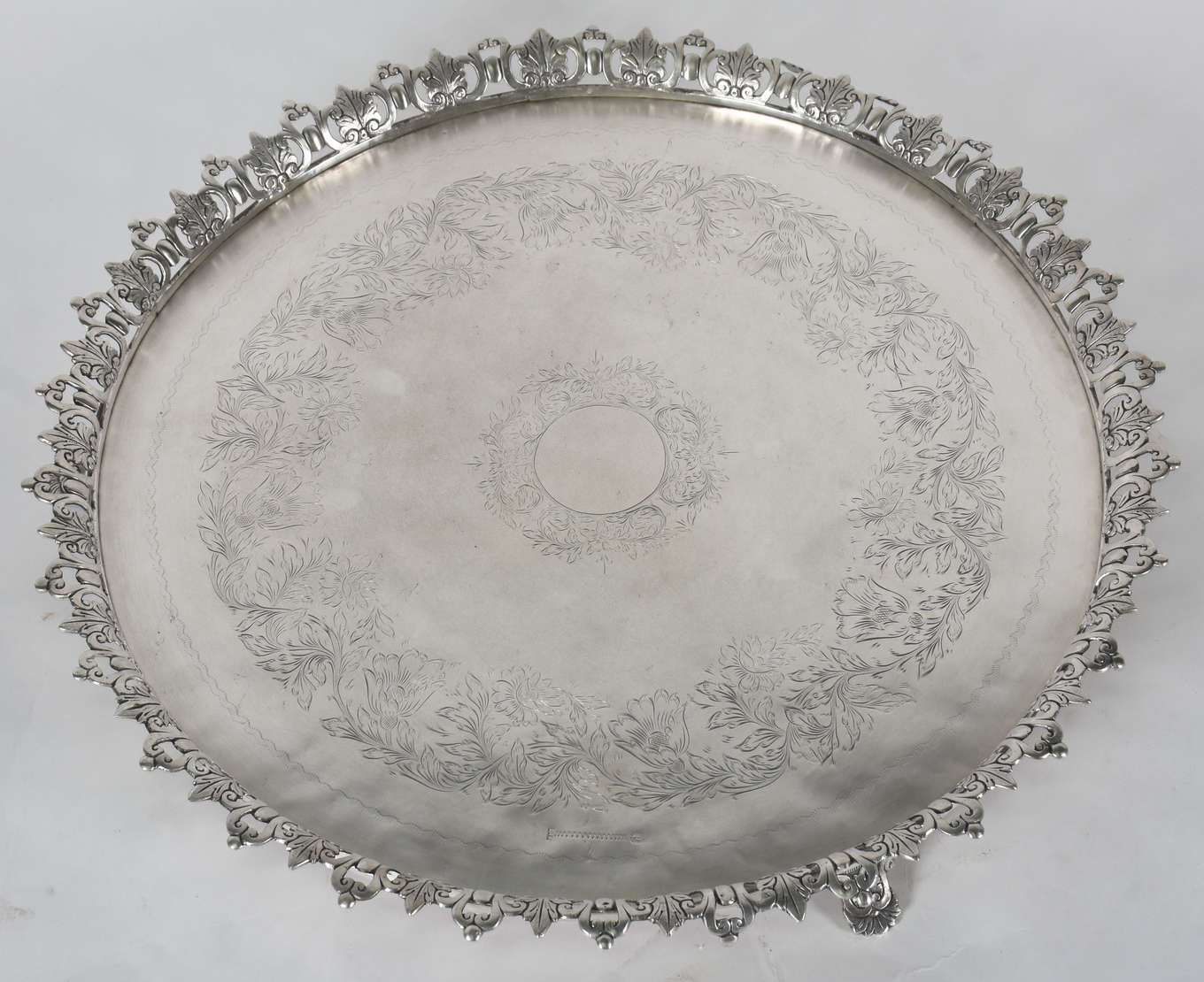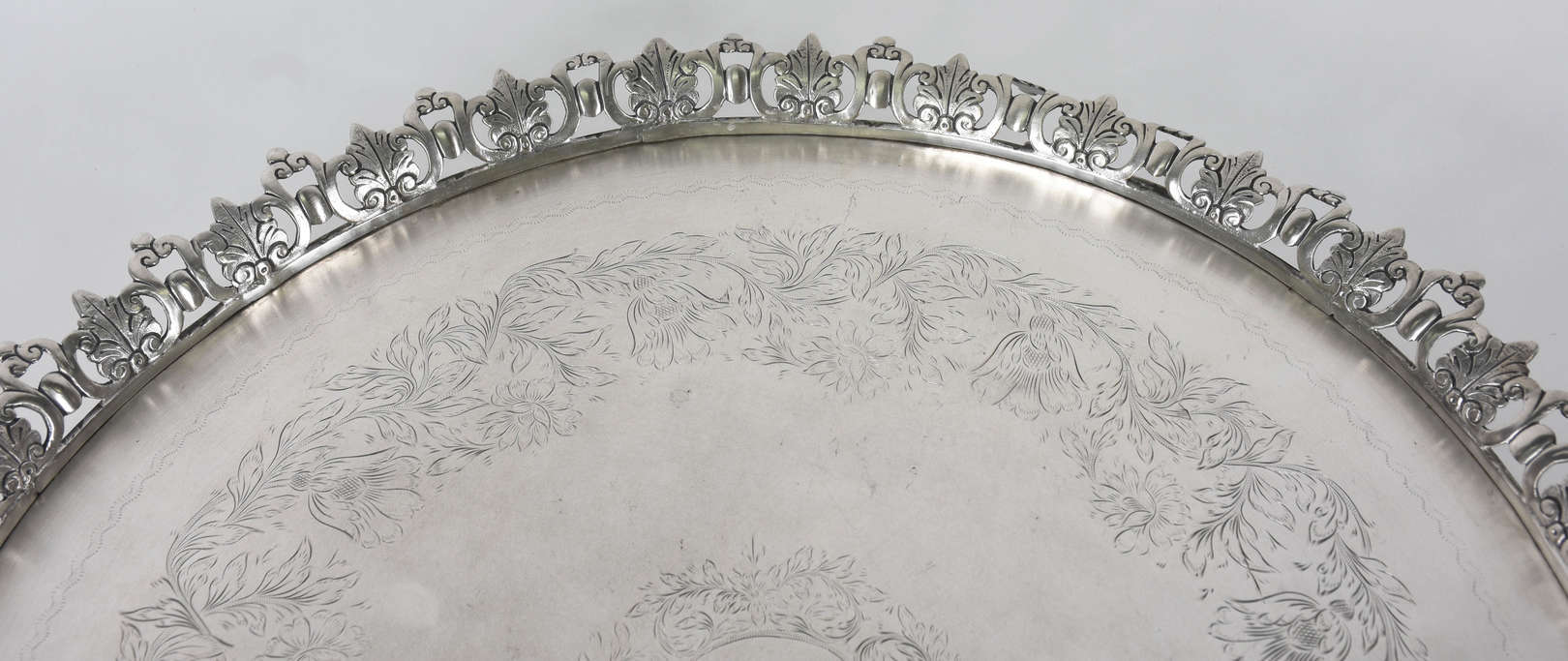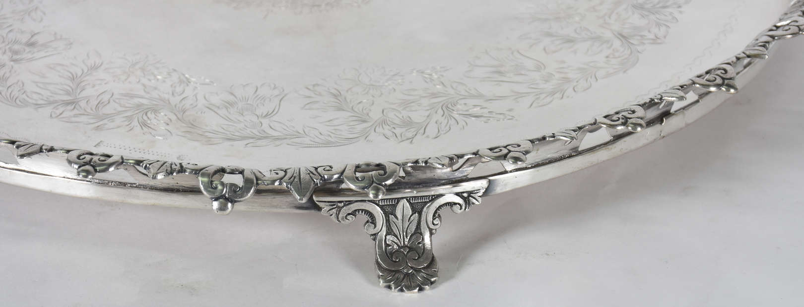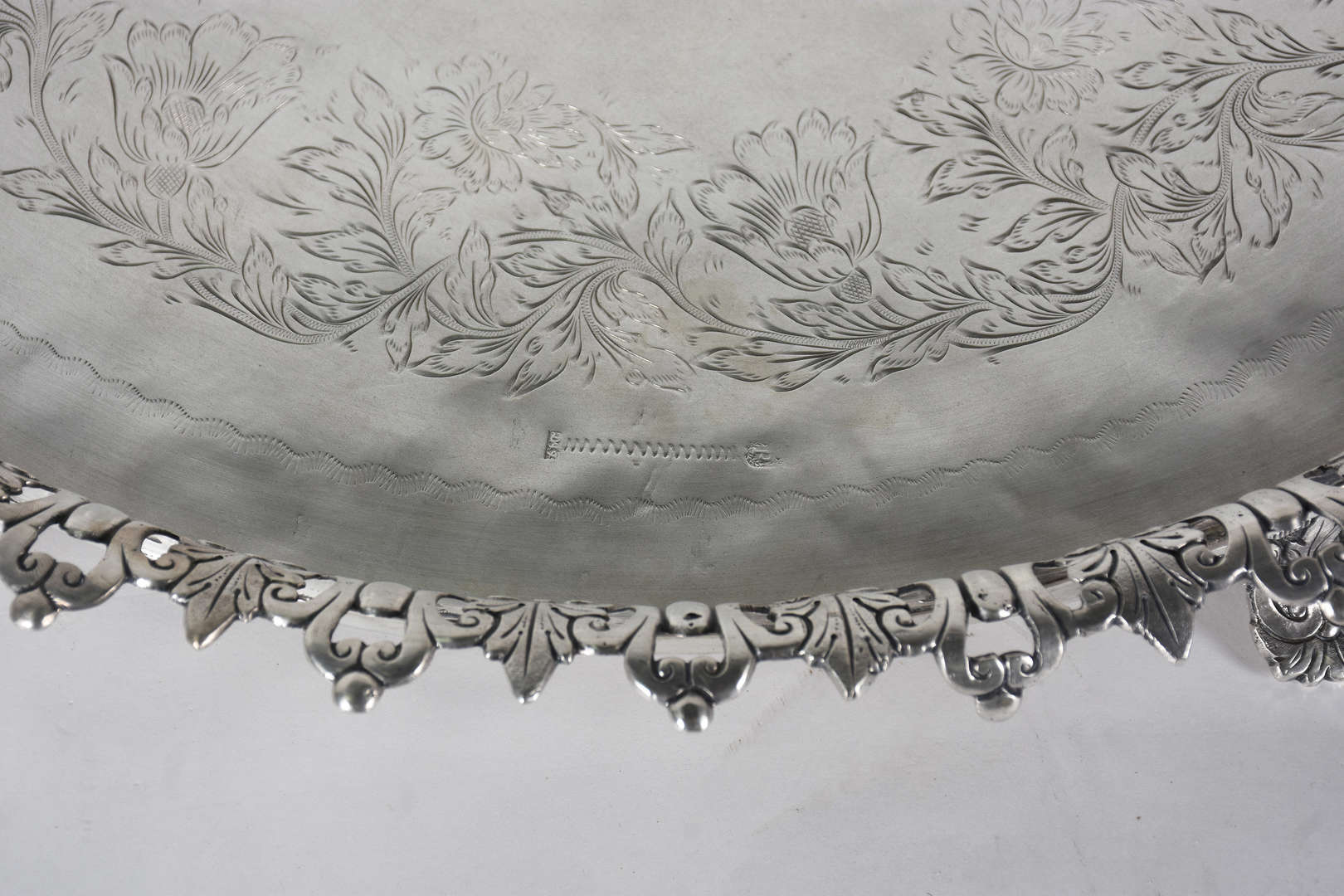 Salva de prata Dona Maria, contrastada, trabalhada com frisos cinzelados, pés de garra. Com amassados. ( Por questã...