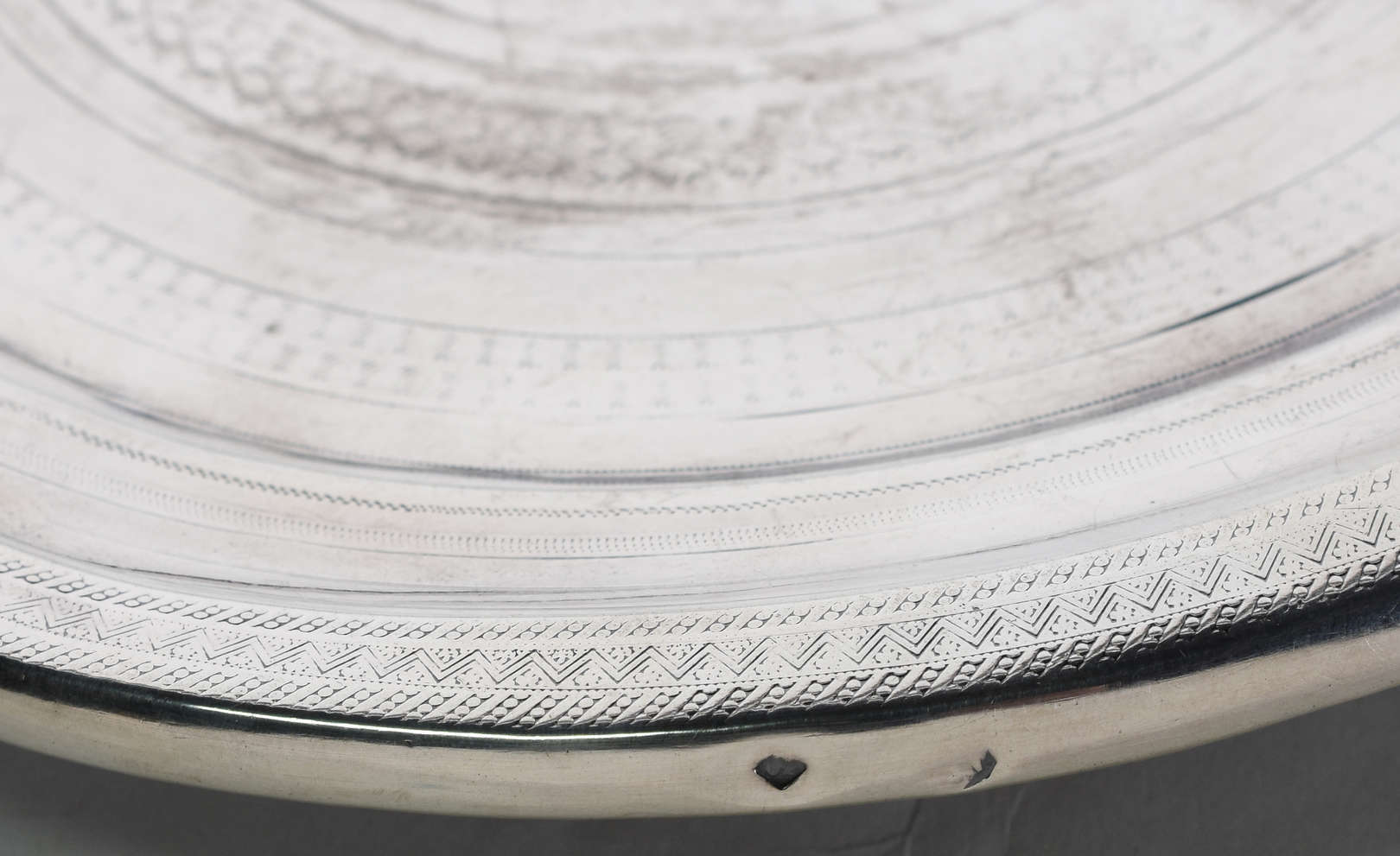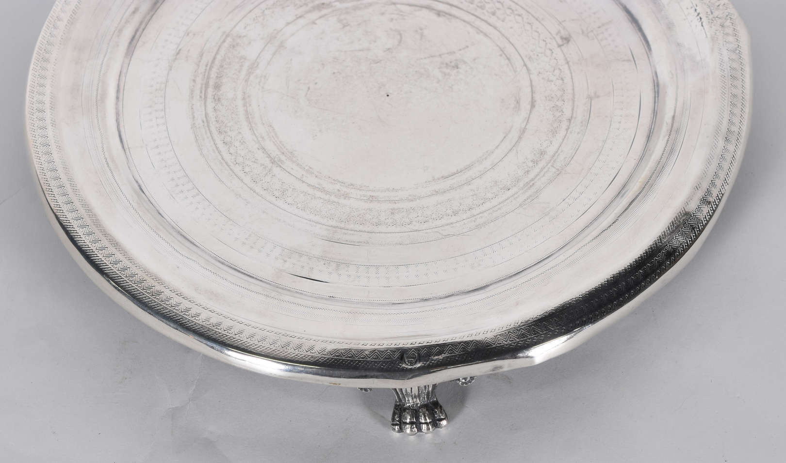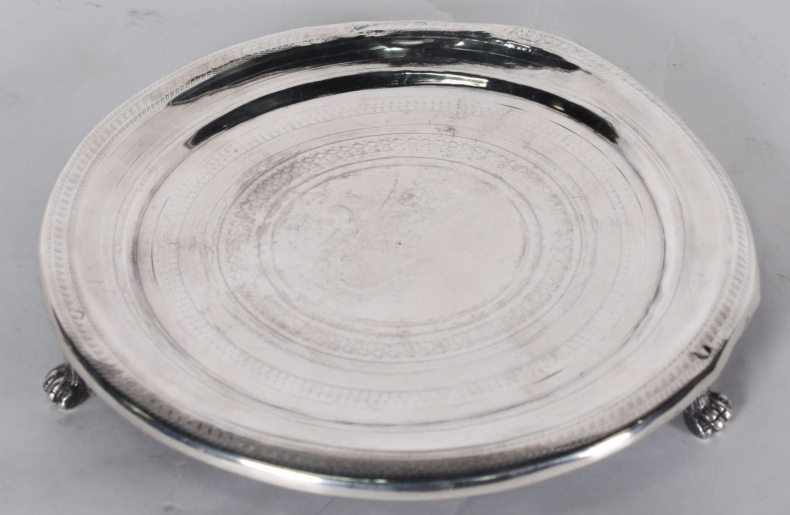 Grande salva de prata portuguesa contrastada, fundo cinzelado e galeria com folhas vazadas.