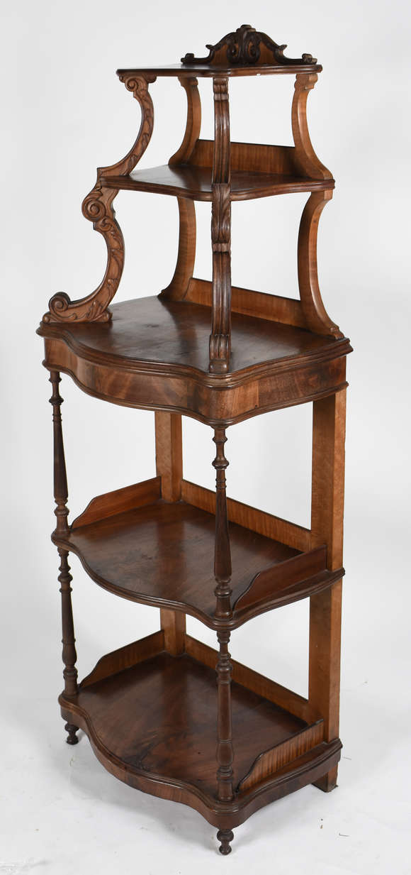 Porta bibelot de madeira nobre com 5 platôs ligados por pequenas colunas torneadas e recortadas..
