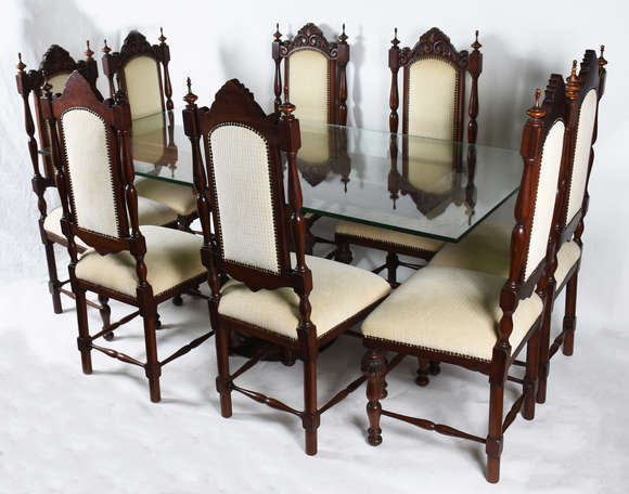 Mesa de jantar de madeira nobre, estilo colonial brasileiro, tampo de vidro e base de madeira na forma de coluna . Ac...