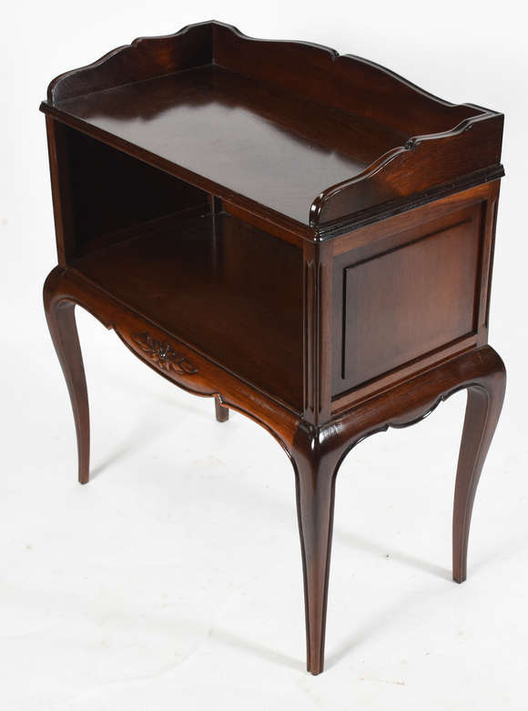 Mesa de encostar de madeira nobre, tampo retangular com quinas trabalhadas em relevo, apoio em balaústre central goma...