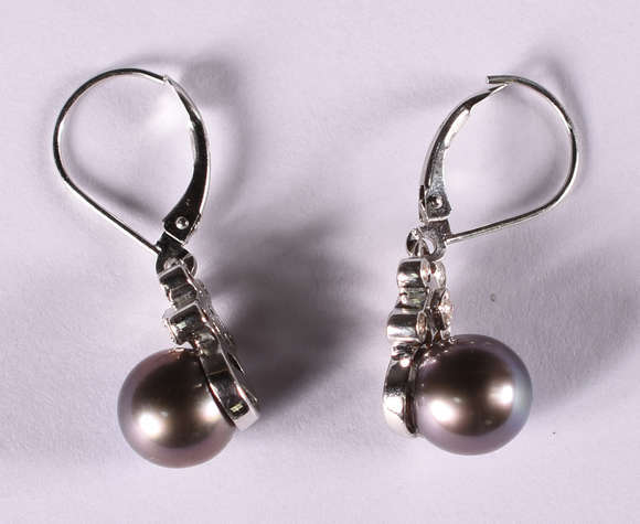 Par de brincos de ouro branco com 10 brilhantes e pérolas negras ( Por questão de segurança a peça não se encontra n...