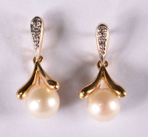 Par de brincos de ouro amarelo com 4 brilhantes e 2 pérolas ( Por questão de segurança a peça não se encontra na loja)