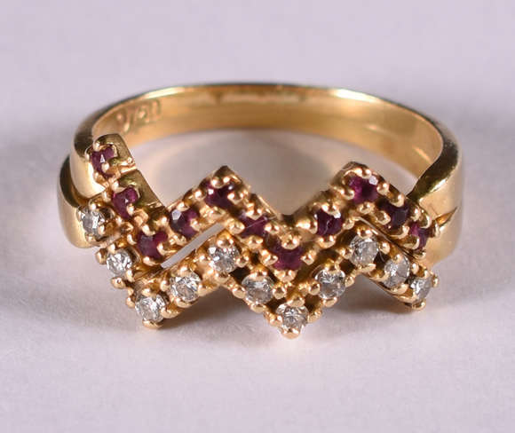 Anel de ouro amarelo 2 em 1 com 10 brilhantes e 10 rubilitas . Aro 16 ( Por questão de segurança a peça não se encon...