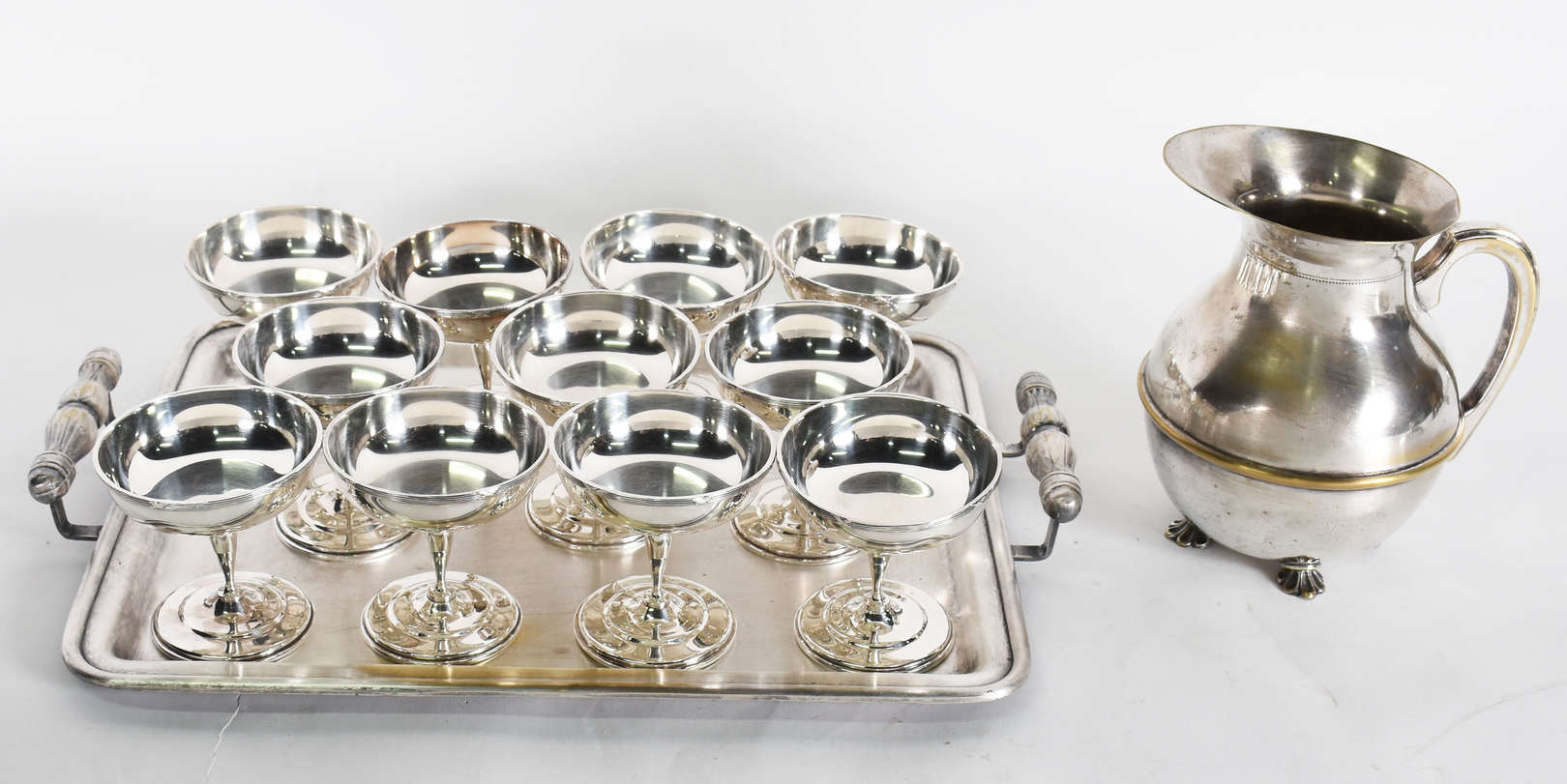 Conjunto para sorvete de metal prateado composto de 11 taças com 11 colheres. No estojo.