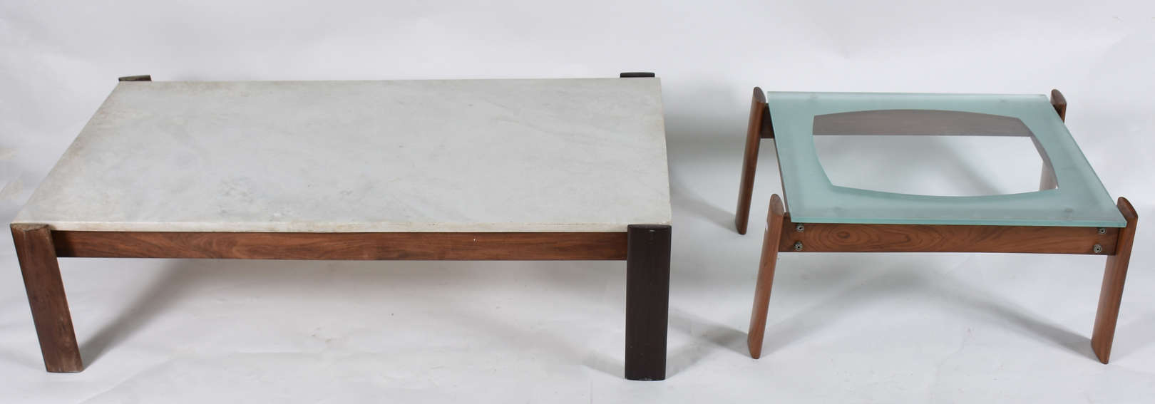 Par de mochos de madeira nobre, estilo Dom José, tampo de couro (uma dos tampos com rasgo no couro).