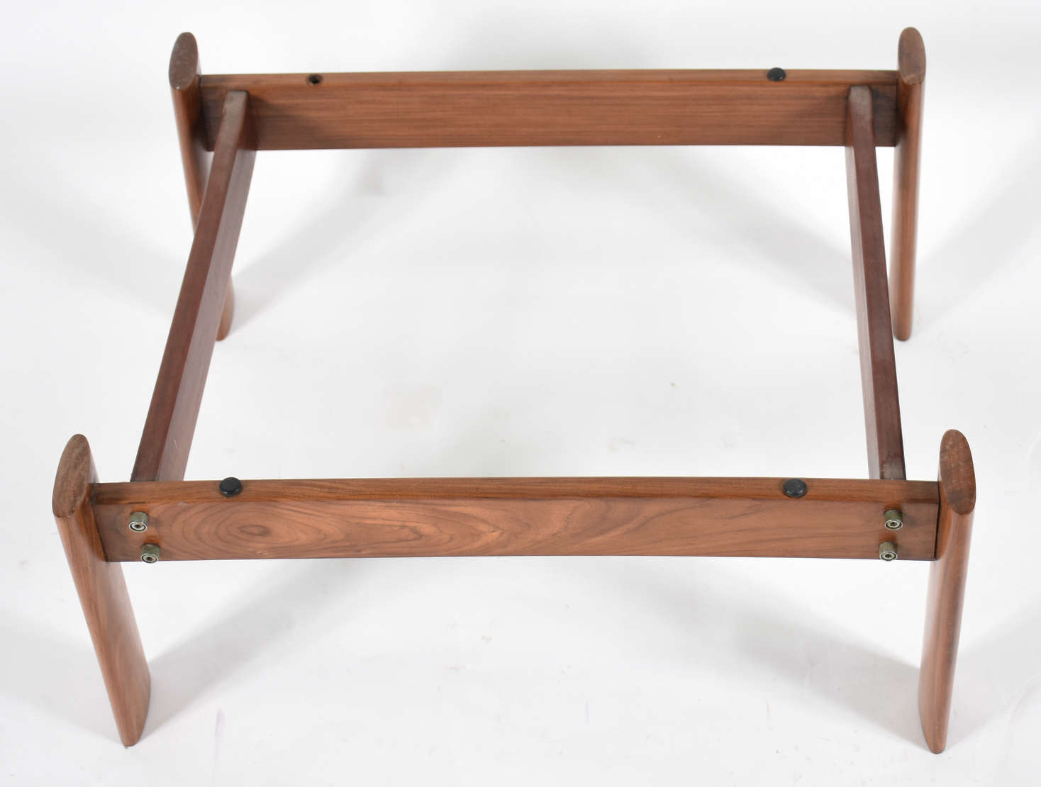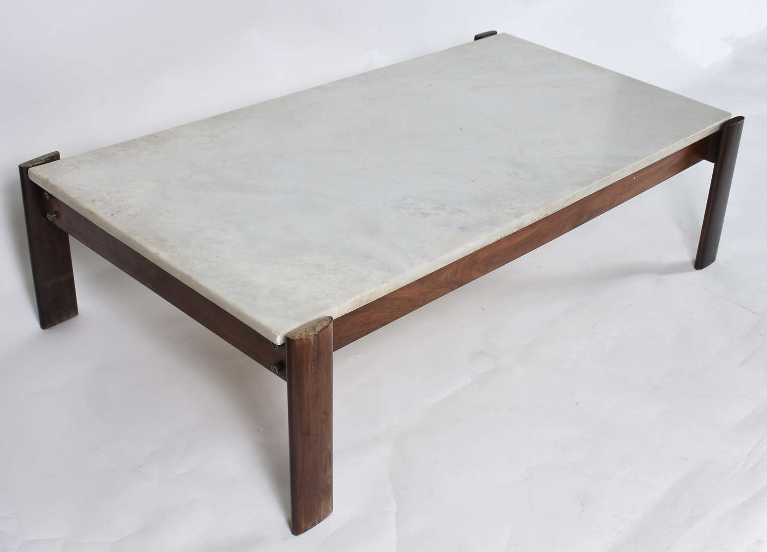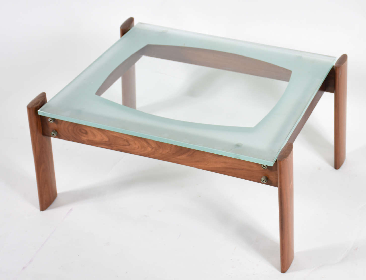 Mesa de encostar de madeira nobre, tampo retangular com quinas trabalhadas em relevo, apoio em balaústre central goma...