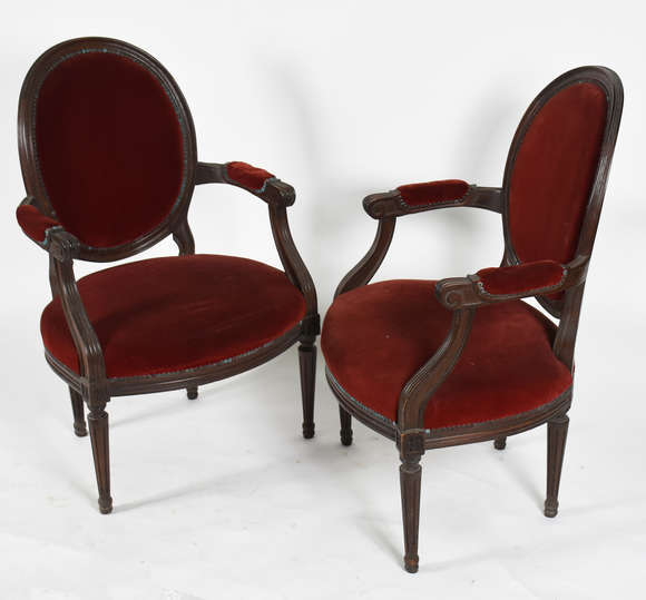 Par de cadeiras tipo Luís XV com estofado em veludo vermelho .