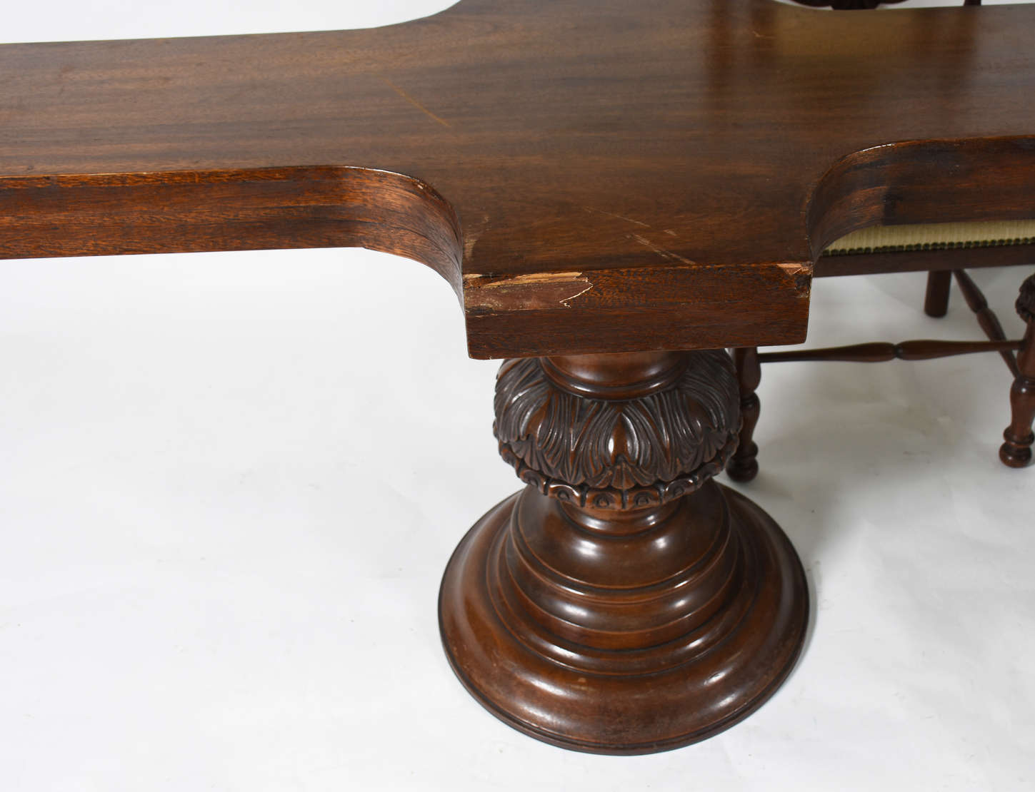 Mesa de encostar de madeira nobre, tampo retangular com quinas trabalhadas em relevo, apoio em balaústre central goma...