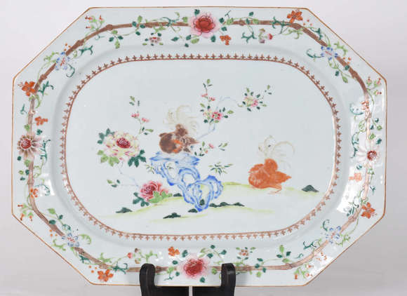Travessa em porcelana Companhia das Índias do Serviço dos Galos. Decoração com ricos esmaltes em tons de branco, roug...