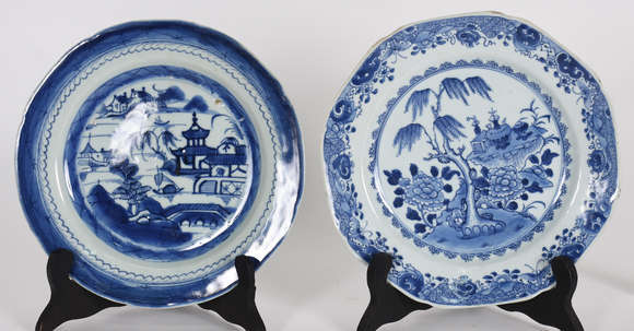 Dois pratos de porcelana Macau azul e branco, com cenas de pagodes.