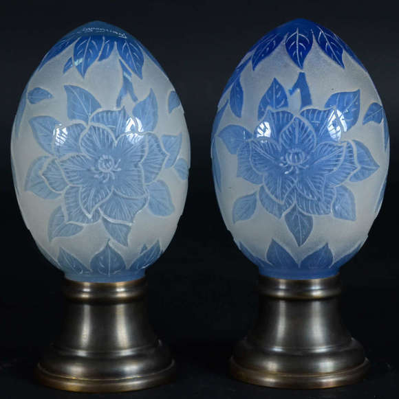 Par de pinhas de vidro azul , bases de metal . Assinadas.