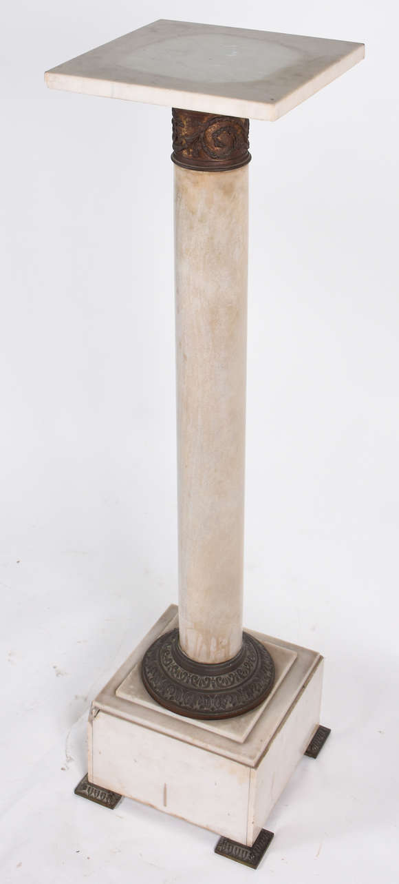 Coluna de mármore com corpo cilíndrico, tampo e base quadradas, guarnições de bronze.