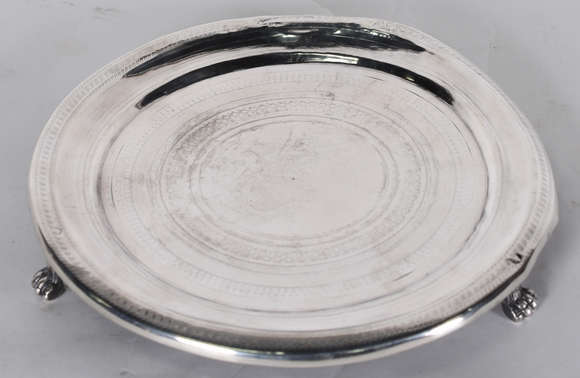 Salva de prata Dona Maria, contrastada, trabalhada com frisos cinzelados, pés de garra. Com amassados. ( Por questã...