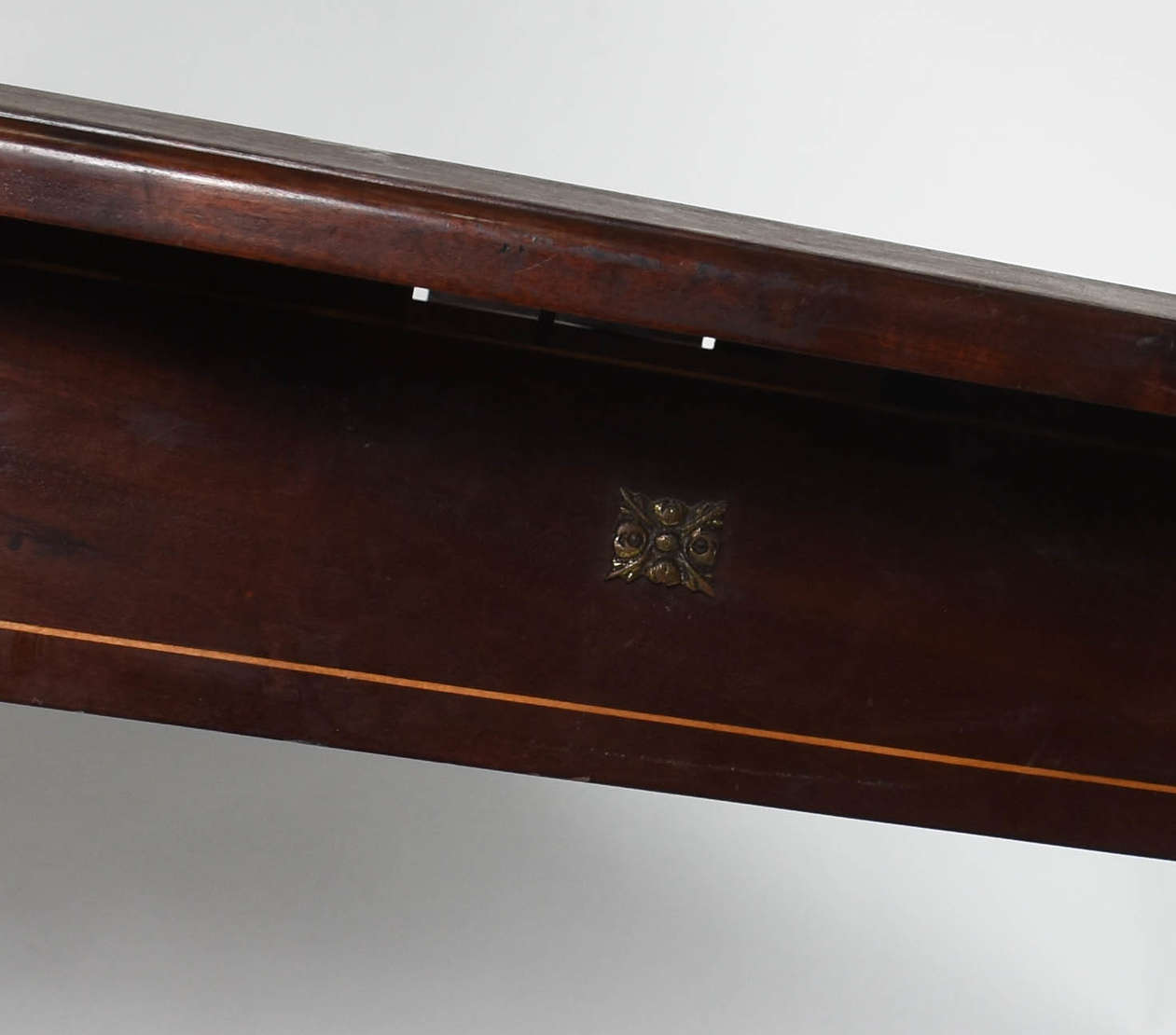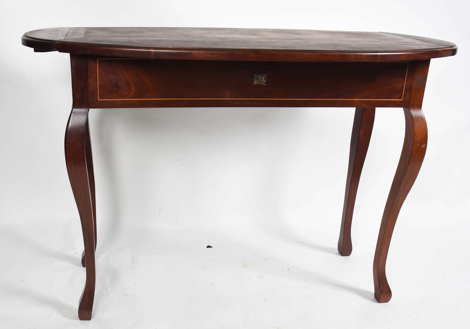 Mesa de madeira com tampo de mármore e 2 gavetas .