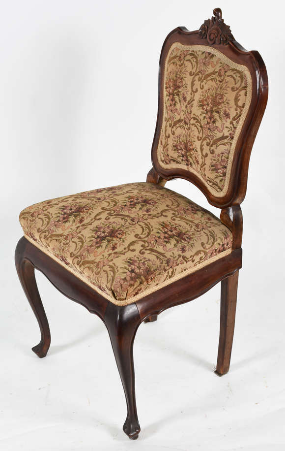 cadeira singela de madeira nobre forrada com gobelain floral . Medidas 47 x 40 cm.