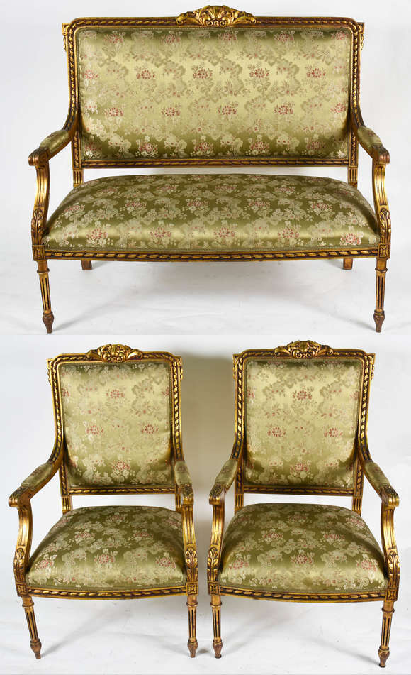 Conjunto de sofá e par de poltronas de madeira dourada com estofamento forrado com tecido adamascado floral . Medida...